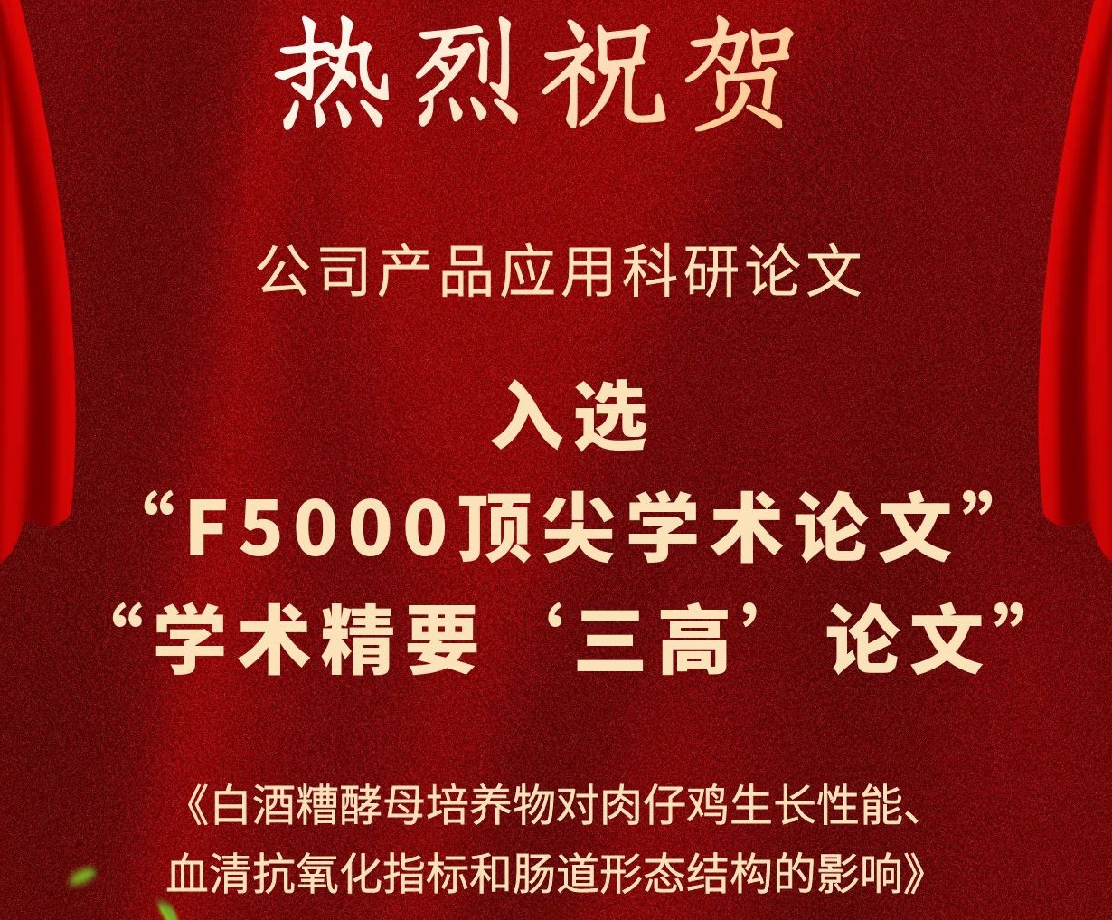 近日,公司產品應用科研領域又聞佳訊傳來! 公司與中國農業科學院飼料研究所家禽營養與飼料創新團隊共同完成并發表于《動物營養學報》(2019,31(5): 2357-2366)的學術論文—《白酒糟酵母培養物對肉仔雞生長性能、血清抗氧化指標和腸道形態結構的影響》,入選2022年度“領跑者5000—中國精品科技期刊頂尖學術論文(F5000)”和學術精要(2023年5-6月)高PCSI論文、高被引論文和高下載論文。 該論文探究了公司白酒糟酵母培養物對肉仔雞生長性能、血清抗氧化指標和腸道形態結構的影響。研究表明,飼糧添加白酒糟酵母