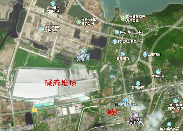 連云港堿廠與堿渣堆場的衛星圖。占地約6000畝的堿渣堆場,愈發成為企業不能承受之重