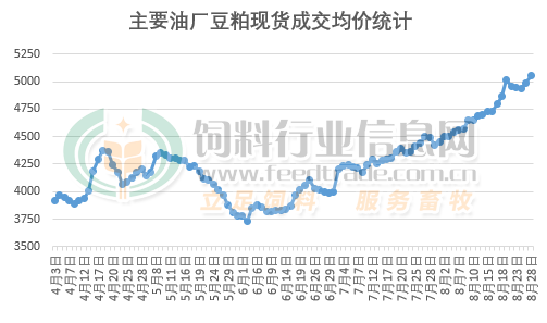 據飼料行業信息網數據顯示:8月28日,國內豆粕市場均價突破5000元/噸大關,創下了自6月份觸底反彈以來的新高。