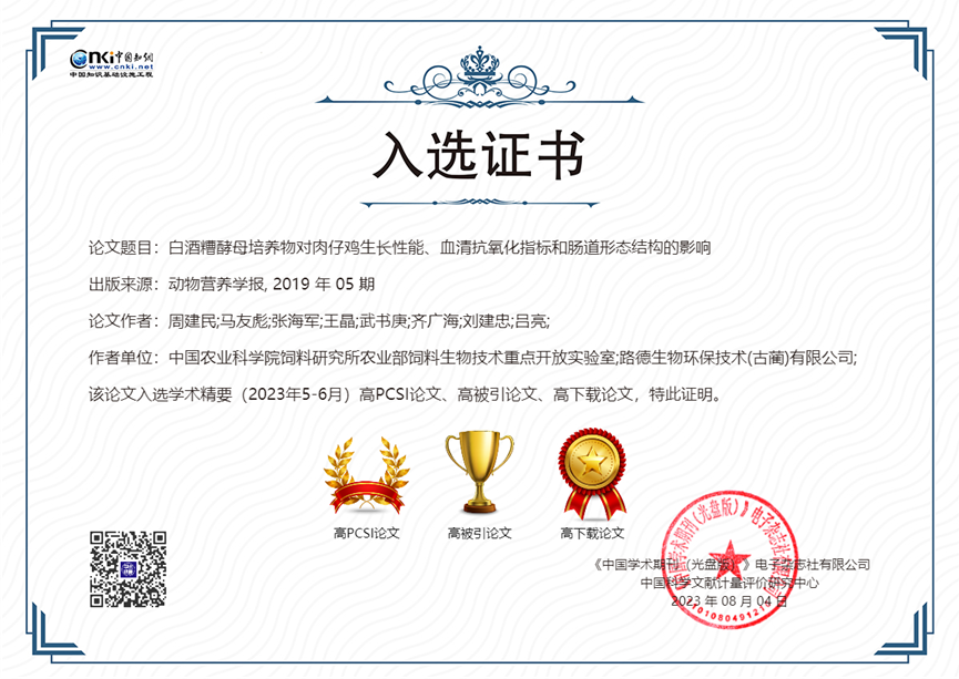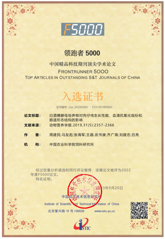 公司與中國農業科學院飼料研究所家禽營養與飼料創新團隊共同完成并發表于《動物營養學報》(2019,31(5): 2357-2366)的學術論文—《白酒糟酵母培養物對肉仔雞生長性能、血清抗氧化指標和腸道形態結構的影響》,入選2022年度“領跑者5000—中國精品科技期刊頂尖學術論文(F5000)”和學術精要(2023年5-6月)高PCSI論文、高被引論文和高下載論文。