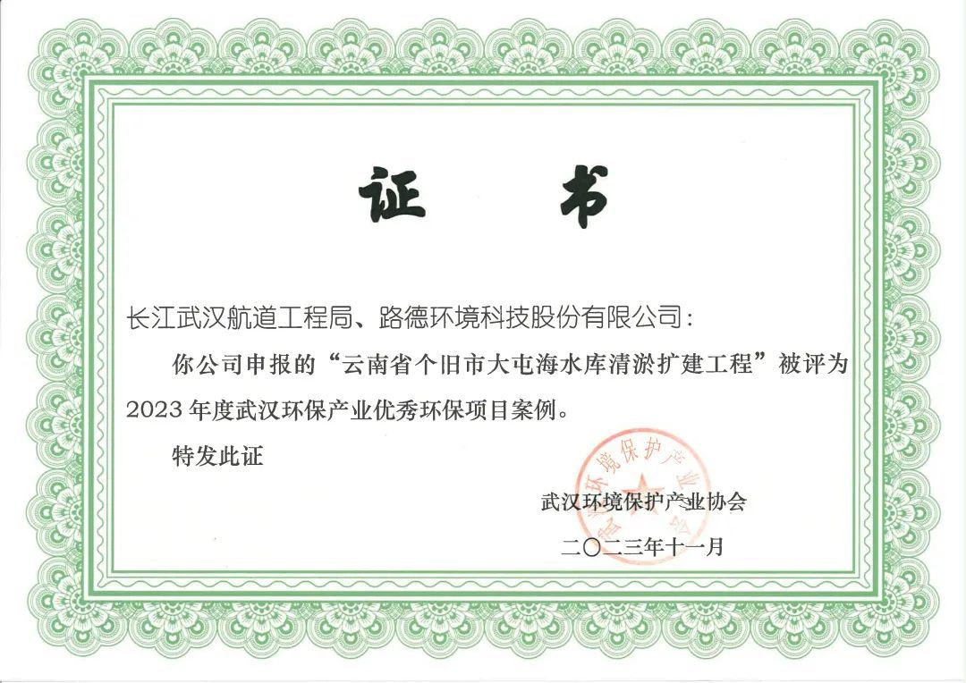 公司“云南省個舊市大屯海水庫清淤擴建工程”被武漢環境保護產業協會評選為“2023年度武漢環保產業優秀環保項目案例”。