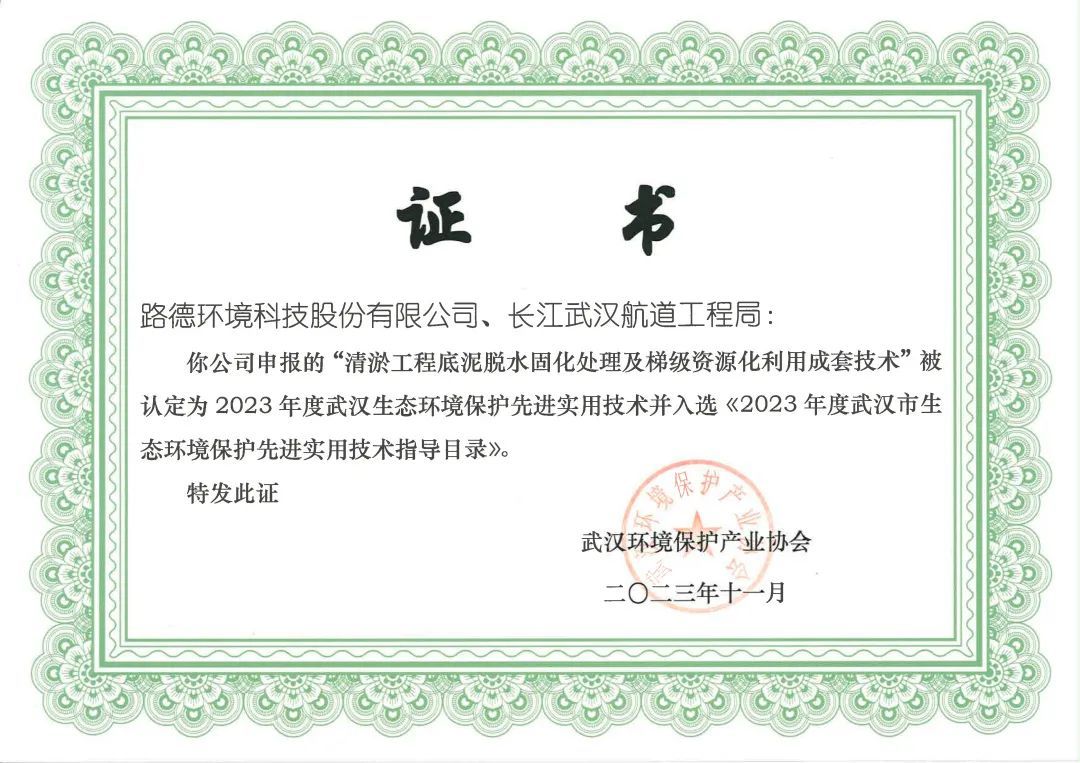 公司“清淤工程底泥脫水固化處理及梯級資源化利用成套技術”被武漢環境保護產業協會認定為“2023年度武漢生態環境保護先進實用技術”并入選《2023年度武漢市生態環境保護先進實用技術指導目錄》。