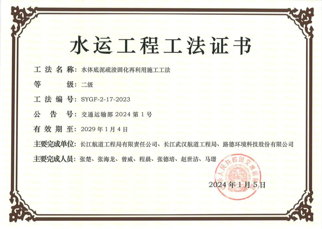 近期,交通運輸部公布了2023年度水運工程工法評審結果,路德環境聯合長江航道工程局有限責任公司、長江武漢航道工程局共同申報的“水體底泥疏浚固化再利用施工工法”榮獲交通運輸部2023年度水運工程二級工法。