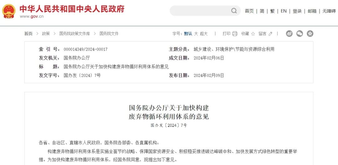 事實上,政府工作報告并不是唯一的信號。早在今年2月9日,國務院辦公廳印發《關于加快構建廢棄物循環利用體系的意見》(下稱《意見》),就透露出一些與眾不同的信號。