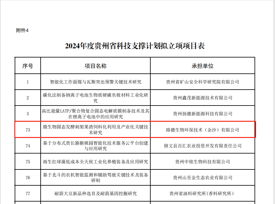 近日,貴州省科學技術廳公布了省科技計劃擬立項項目,路德環境旗下子公司——路德生物環保技術(金沙)有限公司承擔的“微生物固態發酵刺梨果渣飼料化利用及產業化關鍵技術研究”項目,入選“2024年度貴州省科技支撐計劃擬立項項目”。