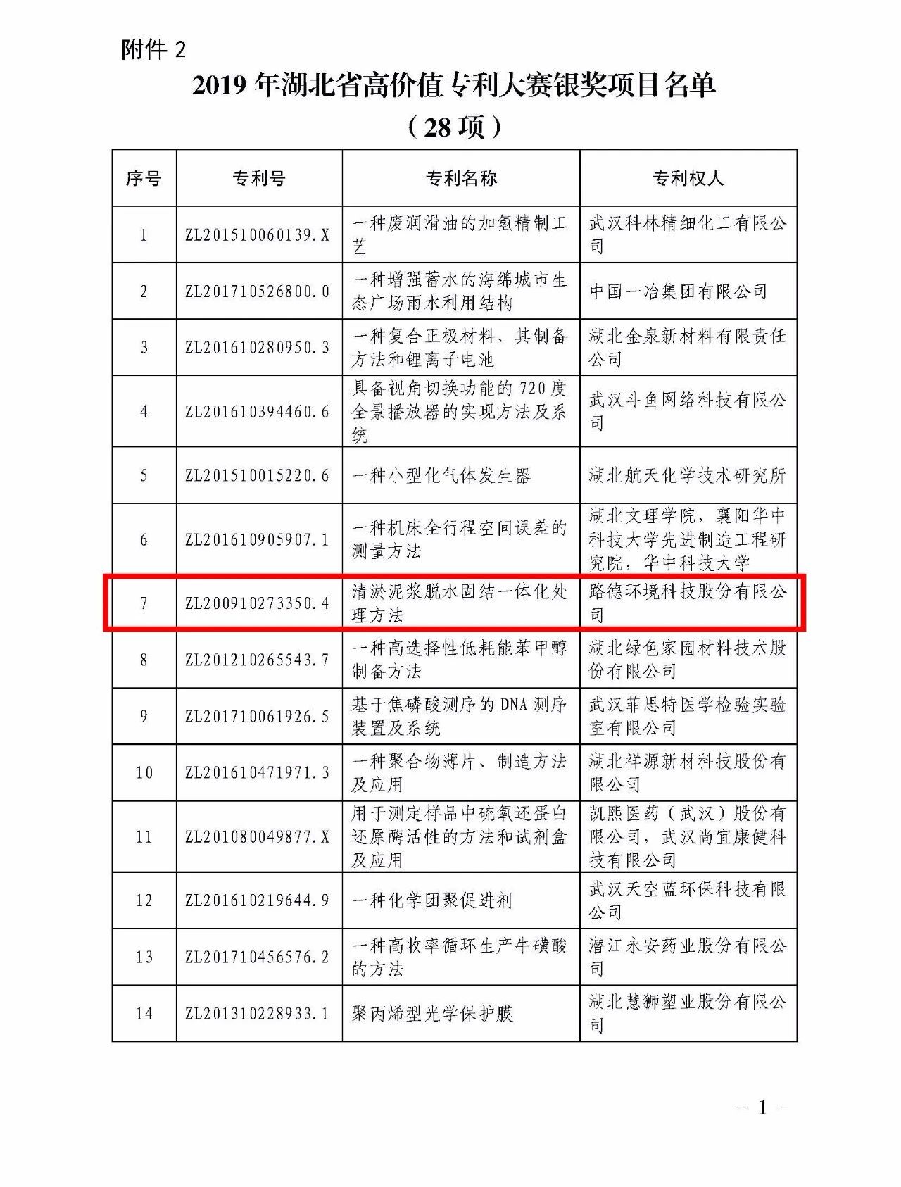 6月12日,湖北省知識產權局公布2019年湖北省高價值專利大賽結果。路德環境科技股份有限公司呈報的《清淤泥漿脫水固結一體化處理方法》榮獲2019年湖北省高價值專利大賽銀獎。