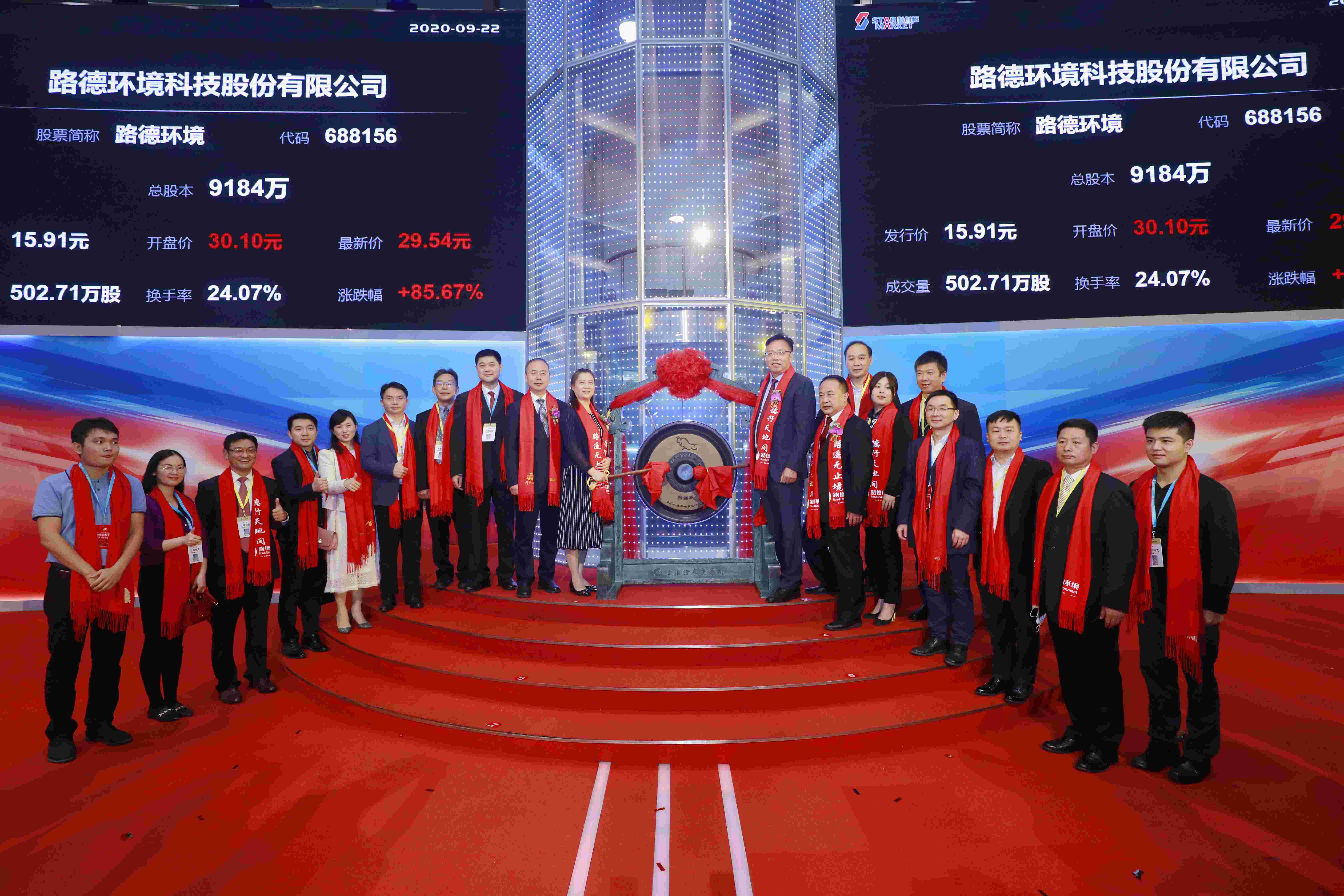 ????? 2020年9月22日上午9時30分,一聲響亮的鑼鳴,伴隨著現場熱烈的掌聲,群星璀璨的科創板再添一員環保領域的“大將”,路德環境在上海證券交易敲鐘上市,正式登陸科創板,股票代碼為688156。