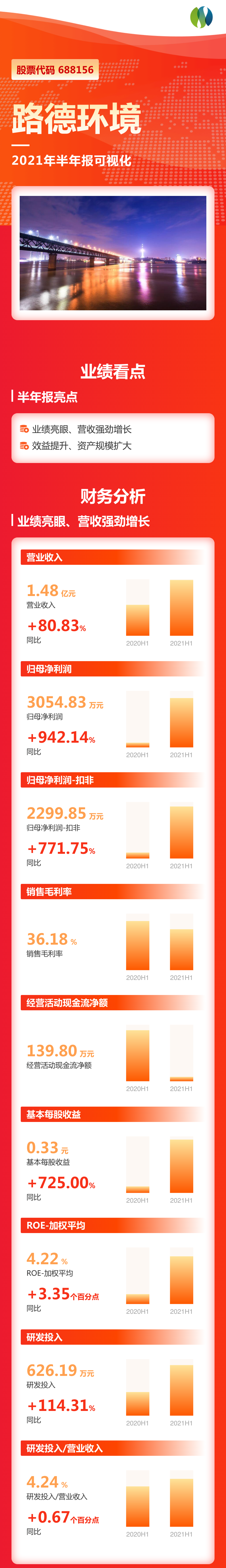 8月19日,路德環境發布2021年半年報,上半年,公司實現營業收入14785.15萬元,同比增長80.83%;歸屬于上市公司股東的凈利潤3054.83萬元,同比增長942.14%。